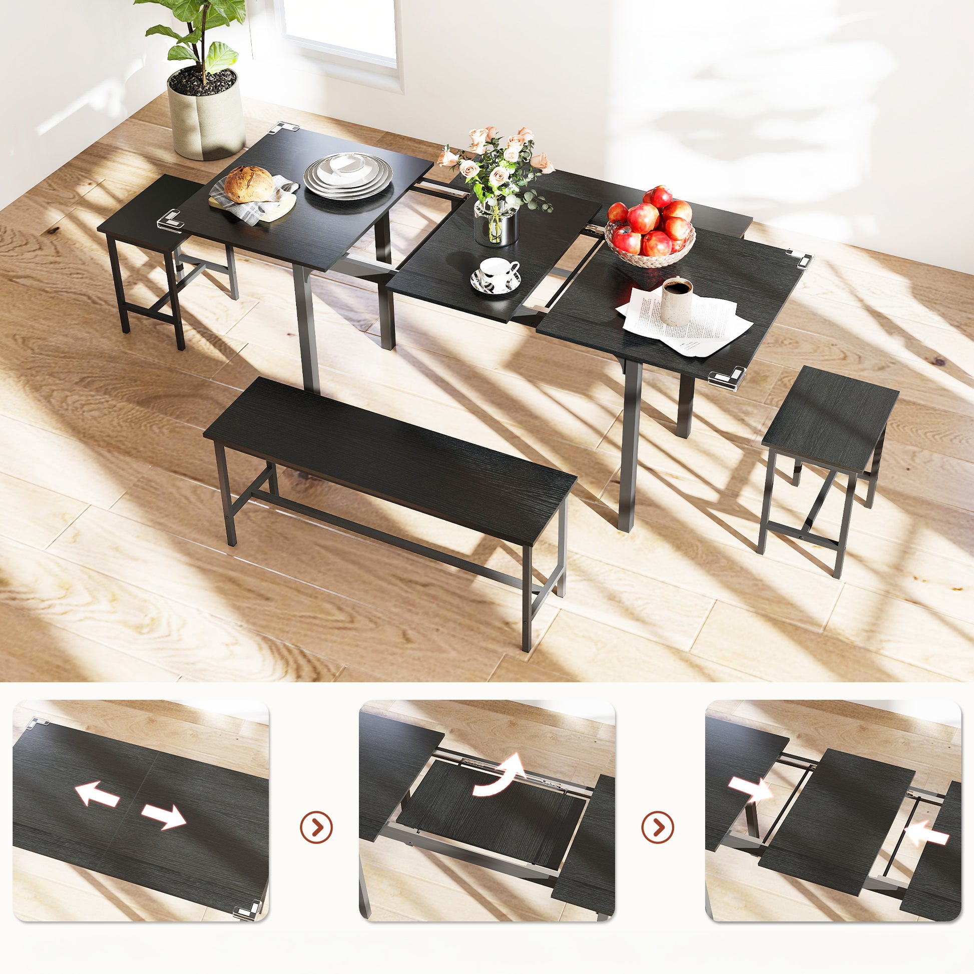 Create memorable dining experiences with this comprehensive 5-piece set featuring an extendable table, two benches, and two stools. Designed for ultimate flexibility, this sophisticated black dining set expands from intimate 4-person dinners to spacious 6-person gatherings while providing space-saving storage solutions perfect for apartments and smaller homes.