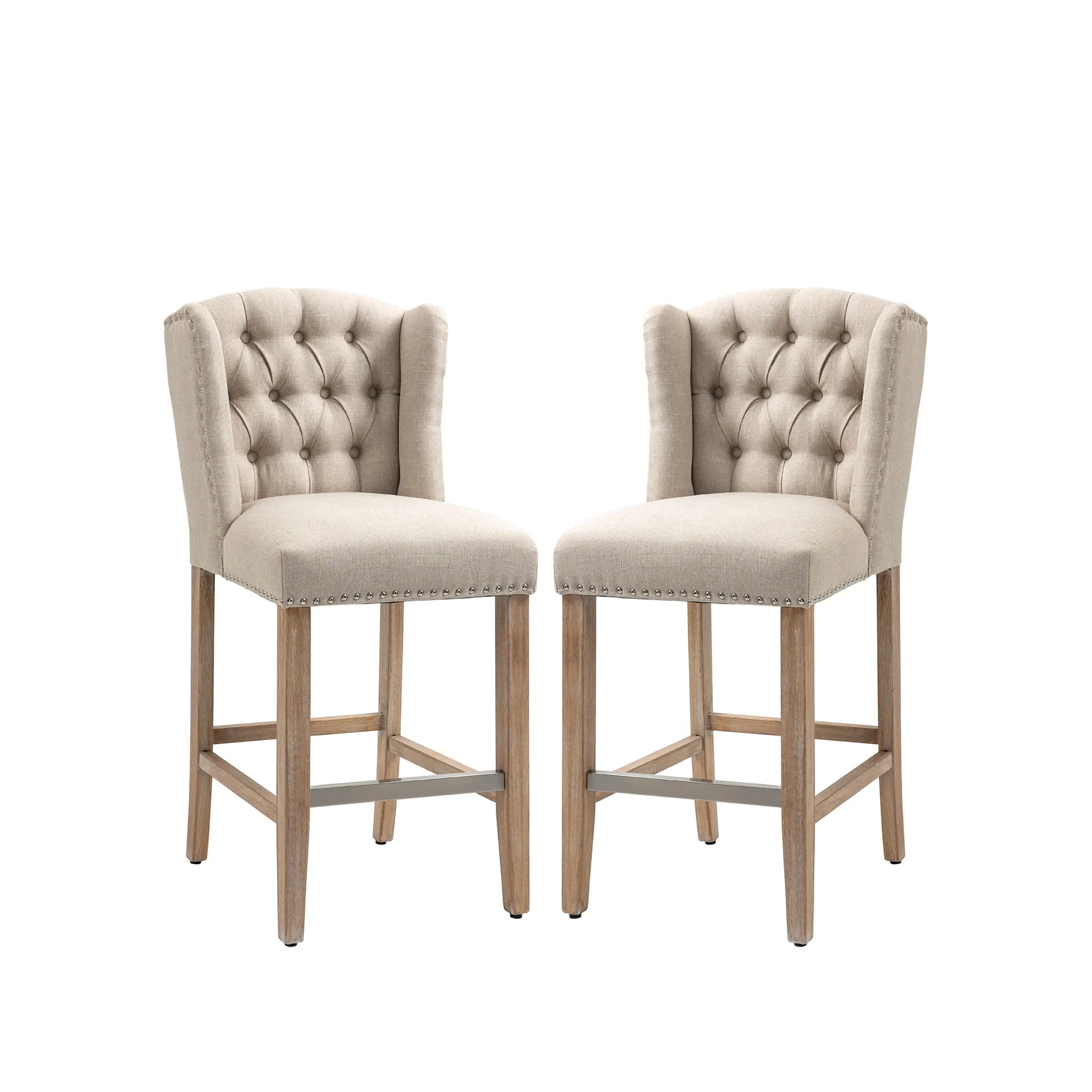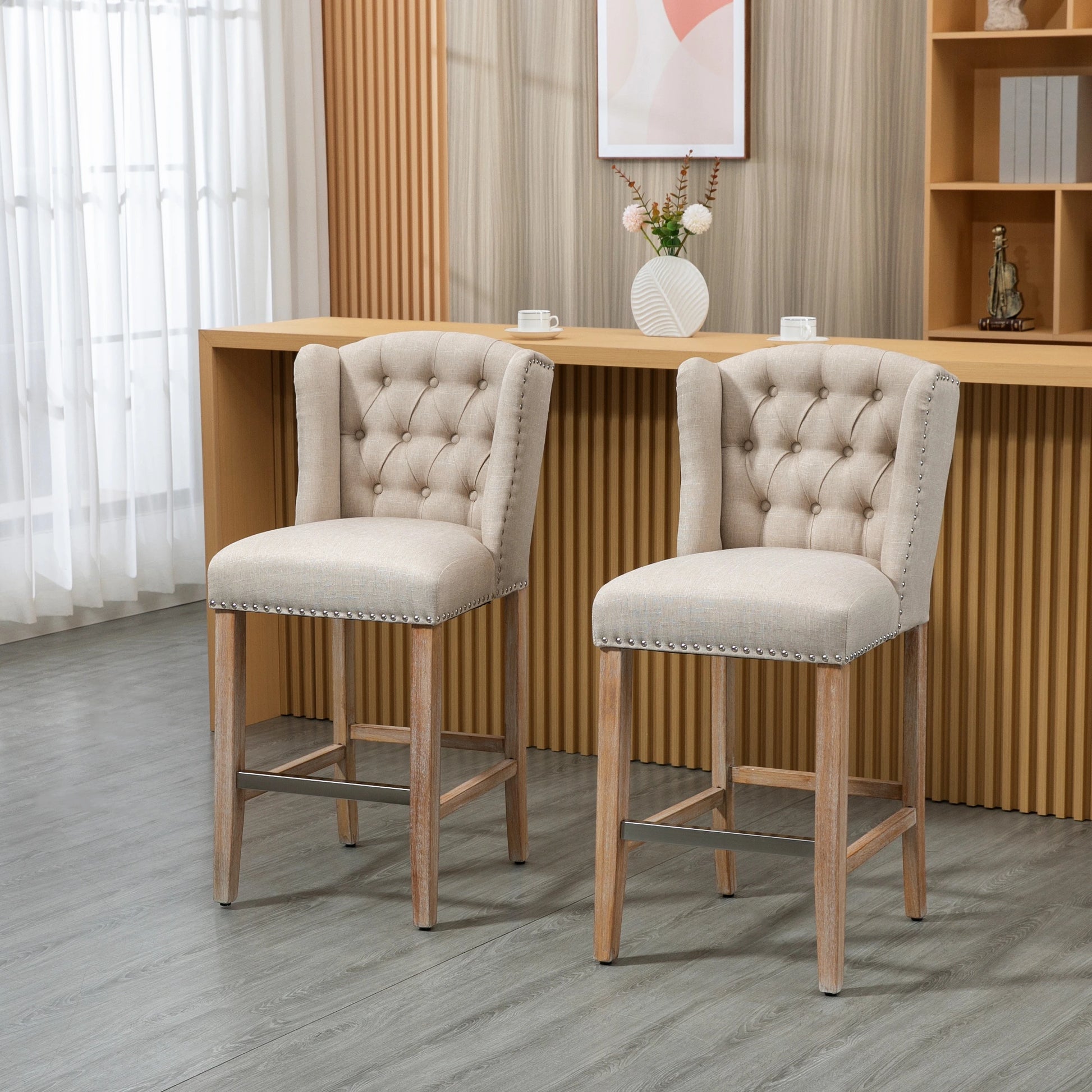 Upholstered Bar Stools with Tufted Nailhead Trim and Wood Legs, Beige (Set of 2)