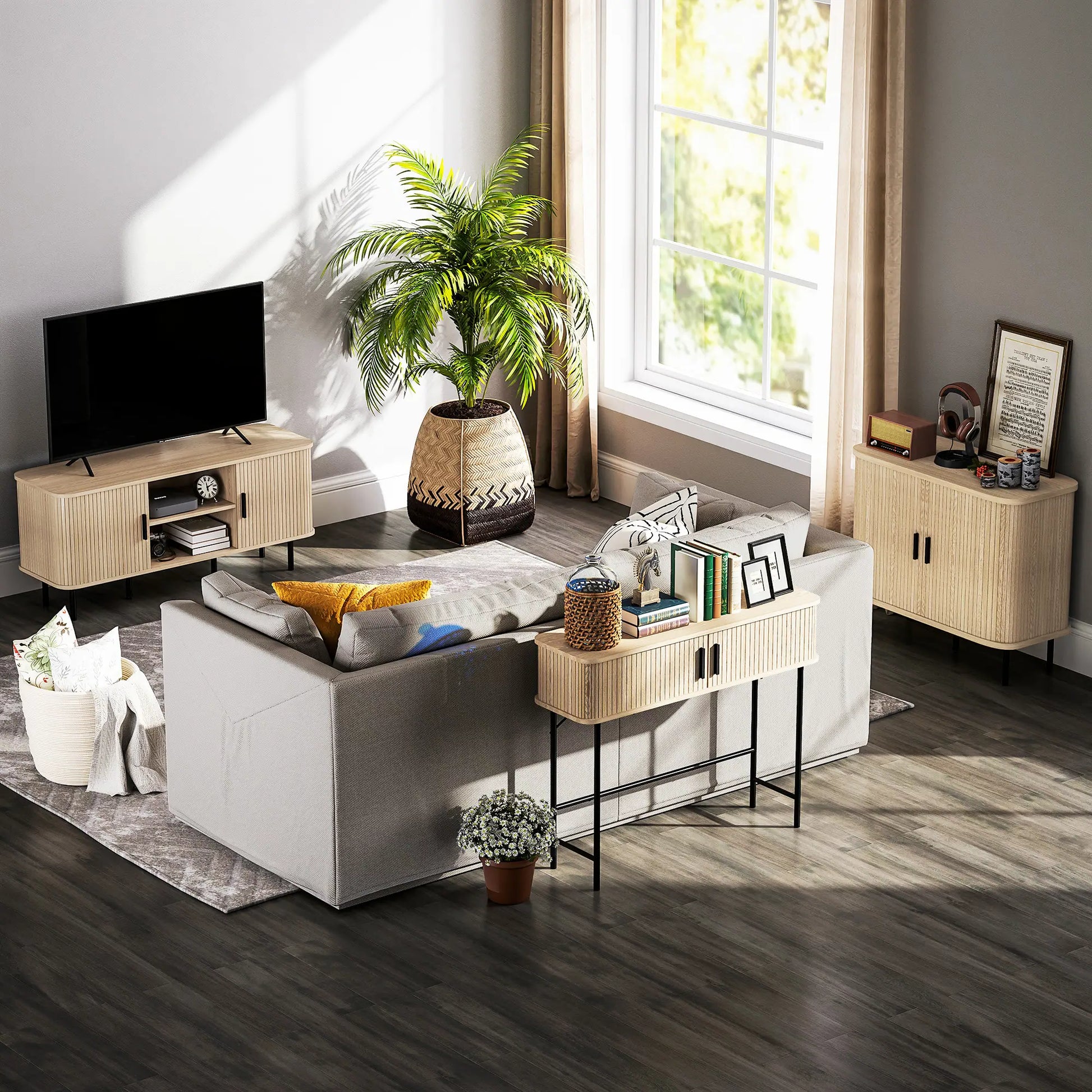 Make a bold design statement with this distinctive mid-century modern console table featuring authentic slatted tambour doors and striking two-tone finish. The space-saving sliding door system and robust construction create the perfect blend of vintage aesthetics and contemporary functionality.