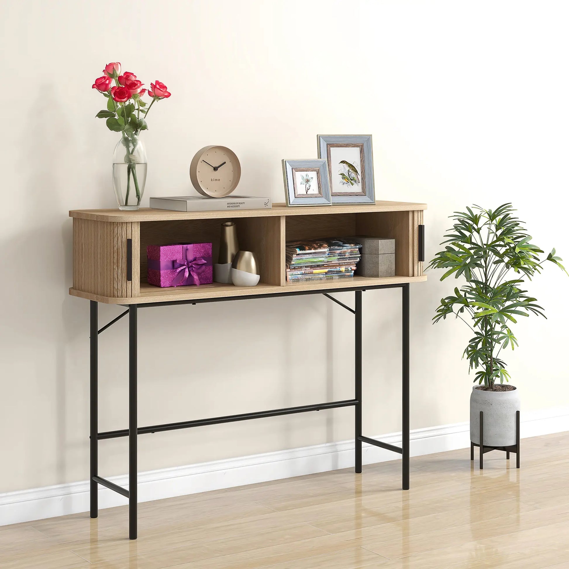 39" Mid-Century Console Table with Sliding Tambour Doors, Oak and Black